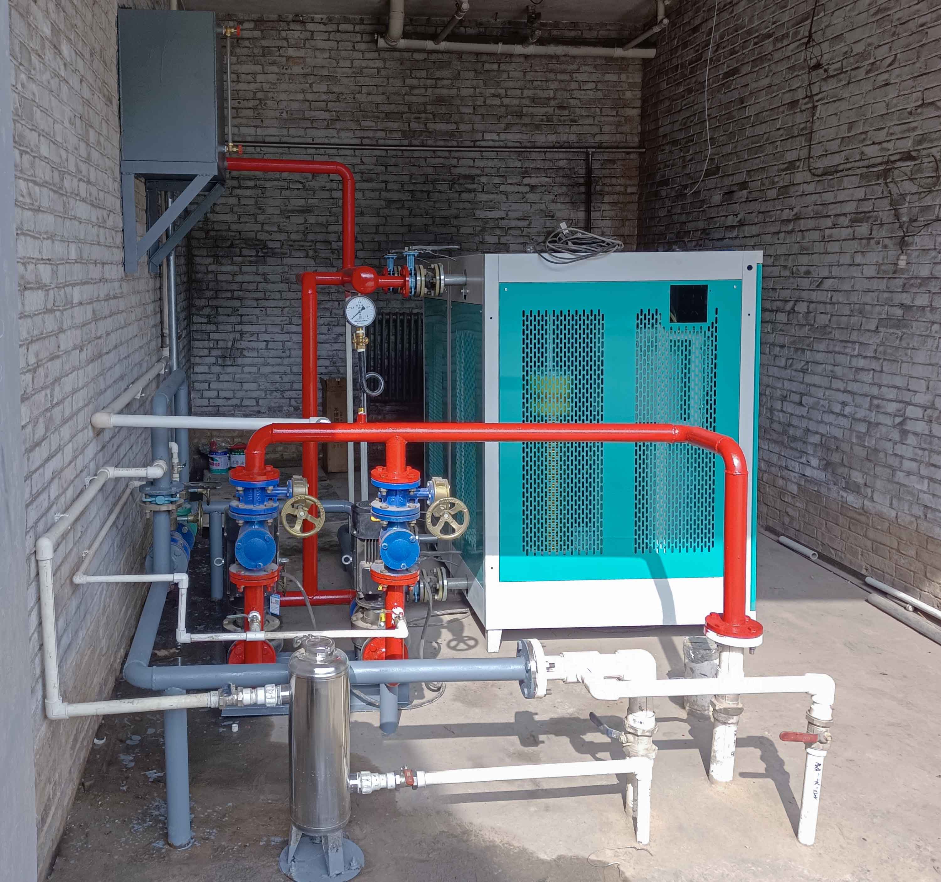 • 2500平方的辦公樓、庫(kù)房和機(jī)修車(chē)間的變頻電磁熱水模塊爐的供暖系統(tǒng)安裝完工,調(diào)試正常,開(kāi)始運(yùn)行。